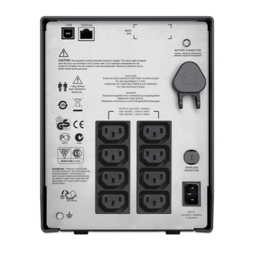 | Detail | APC Smart-UPS, Line Interactive, 1500VA, Tower, 230V, 8x IEC C13 outlets, SmartSlot, AVR, LCD |